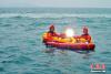 16名中國航天員和2名歐洲航天員,8月21日在山東省煙臺市附近海域圓滿完成了為期17天的海上救生訓練任務。圖為訓練期間,8月8日,受試人員坐在小艇上等待救援。 中新社發(fā) 朱九通 攝 -