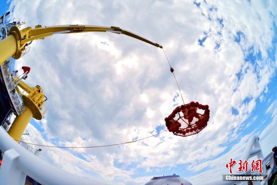 16名中國航天員和2名歐洲航天員,8月21日在山東省煙臺市附近海域圓滿完成了為期17天的海上救生訓練任務。圖為訓練期間,8月2日,甲板上的機械吊臂把救生吊籃起吊入水。 中新社發(fā) 朱九通 攝