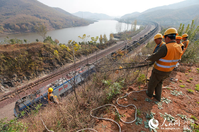 11月17日,河南省南陽工務(wù)段平頂山西橋梁車間職工,一路披荊斬棘,沿著陡峭山坡爬到山頂,對臨近鐵路線兩側(cè)的山體進行雜樹砍伐、危石清除和安裝主動防護網(wǎng)作業(yè)。 -