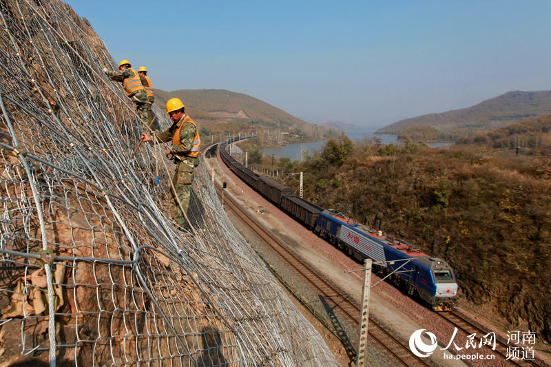 峭壁上“行走”。鐵路兩側(cè)受地形地貌、巖石屬性等復(fù)雜條件的限制和制約,每逢雨雪天氣,時有石塊從山上掉落,山體滑坡、塌方等危險情況隨時可能發(fā)生,嚴重威脅線路設(shè)備和行車的安全。為排除隱患,該段成立山體加固施工隊,根據(jù)之前調(diào)查的整治任務(wù),按照整治方案對山體進行加固防護。(霍亞平) -