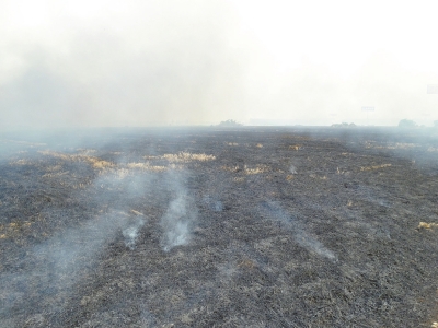 一個多小時后,本報記者趕到現(xiàn)場,見到京港澳高速公路淮河大橋北岸的路東側(cè)麥茬地里,因過火已出現(xiàn)大片的“黑地圖”。沒過火的地塊里,村民們正在用木桿鐵叉,抖撒收割機收割粉碎還田的秸稈,使其蓬松在麥茬上以便燃燒;遠處幾塊麥茬地的地頭處,幾名村民還在不停地放火。