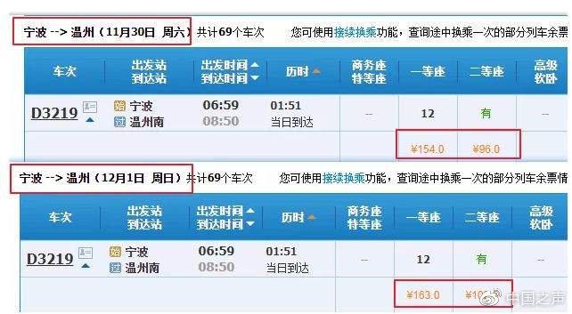 按照5.5折最低折扣,目前蘭州到西安的票價為174.5元,在最低價時,或?qū)⒅恍?6元。然而,票價也并不是都處于降價趨勢,對于部分列車段而言,票價也出現(xiàn)了上升的情況。以寧波開往溫州的G2343次列車為例,11月30日,該車的商務座288元,一等座154元,二等座96元;而12月1日,該車的票價商務座、一等座、二等座分別上漲17元、9元和6元,票價出現(xiàn)了小幅上漲。