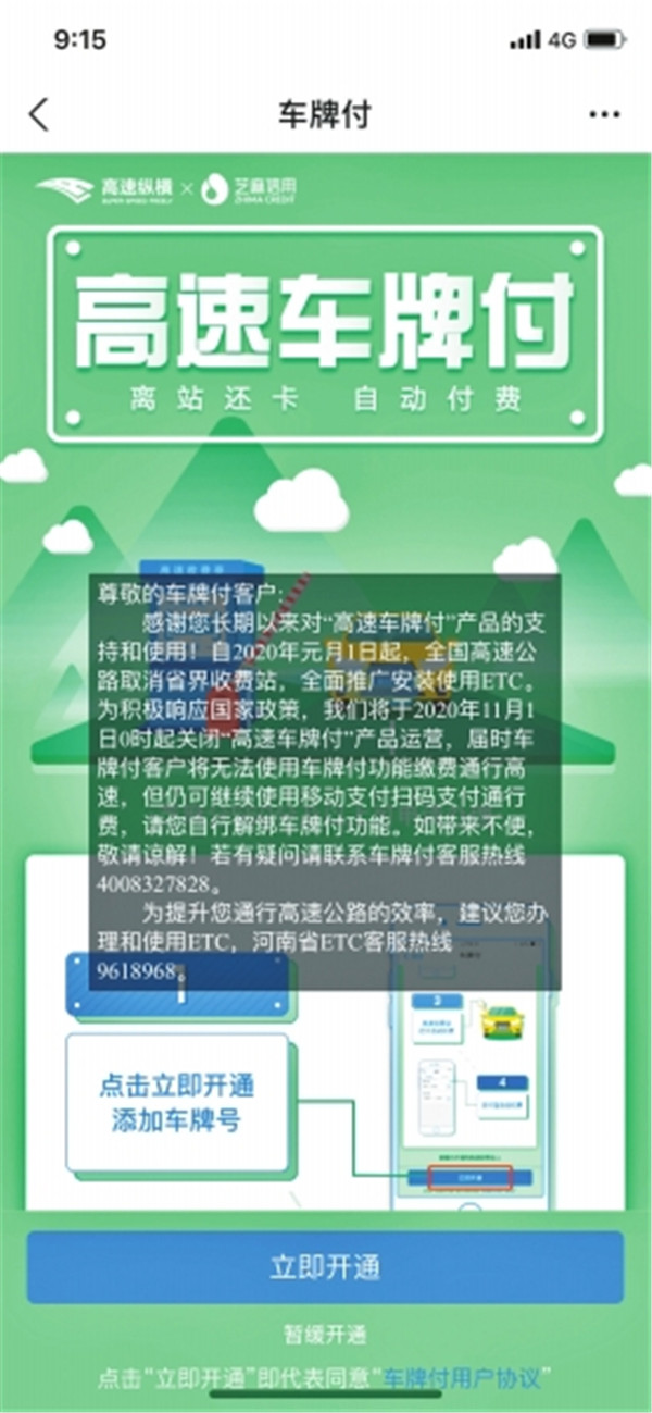 11月2日,記者打開支付寶,高速“車牌付”功能已經(jīng)彈出消息提醒停止使用。(大河報(bào)·大河客戶端記者邵可強(qiáng))