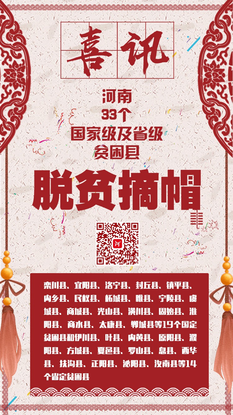 5月9日,我省又有33個(gè)縣“甩”掉貧困縣“帽子”。這是繼蘭考、滑縣、舞陽、新縣、沈丘、新蔡等6縣退出貧困縣序列后,我省脫貧攻堅(jiān)的又一重要成就。