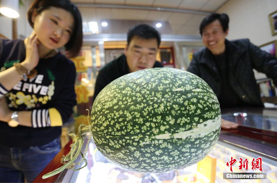 11月25日,河南鄭州,一位女士在展示奇特的“怪瓜”。近日,鄭州市民杜先生到焦作太行山區(qū)旅游時帶回一個奇特的“怪瓜”—— 外形似西瓜,有著葫蘆的秧藤,西瓜的瓤,冬瓜的籽,皮上長著雪花斑紋。這只瓜直徑19公分,長24公分,重4.1公斤。中國農(nóng)業(yè)科學(xué)院鄭州市果樹研究所研究員馬雙武看后認(rèn)為,“怪瓜”名叫黑籽南瓜,為多年生蔓性草本植物,原產(chǎn)中美洲至南美洲海拔較高的山谷里,生長環(huán)境極為嚴(yán)格,日照在13小時以上的地區(qū)或季節(jié)不會形成花芽,極為稀有。河南境內(nèi)的太行山上發(fā)現(xiàn)黑籽南瓜,還是首次,說明當(dāng)?shù)氐臍夂驐l件適合它的生長環(huán)境,作為地方資源開發(fā)有著重要的價值。中新社發(fā) 楊正華 攝
