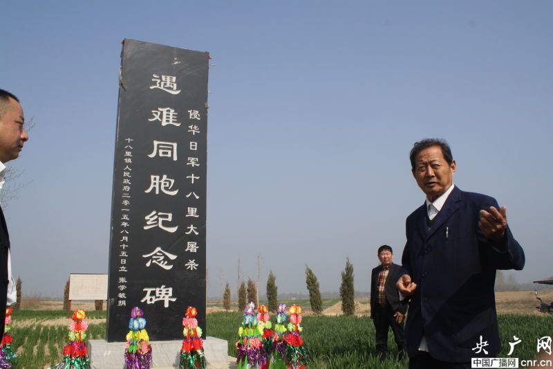 十八里鎮(zhèn)黨委副書記、鎮(zhèn)長張玉海對張先生的義舉表示肯定,他認(rèn)為,在近期日本刪減教科書中的南京大屠殺內(nèi)容、正式施行新修改的安保法的嚴(yán)峻背景下,在彰顯日軍又一大屠殺鐵證的“十八里村遇難同胞紀(jì)念碑”舉行祭奠儀式,意在深切緬懷70多年前遭到日寇屠殺的184位同胞,同時(shí)深情致敬在抗日戰(zhàn)爭中英勇犧牲的千千萬萬革命英烈。