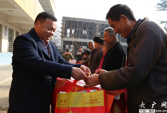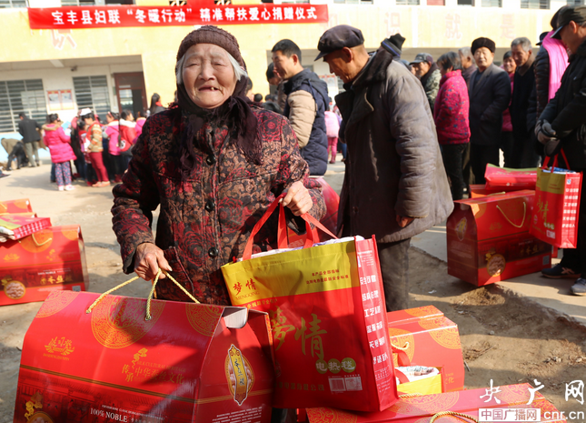 12月16日,河南省寶豐縣李莊鄉(xiāng)程莊村100戶貧困家庭喜領(lǐng)蠶絲被、電熱毯等冬暖禮品,一位老大娘手提過冬用品喜笑顏開。當(dāng)日,被當(dāng)?shù)厝罕姺Q贊為“慈善書記”的河南省寶豐縣趙莊鎮(zhèn)大黃村黨支部書記馬豹子帶著價值4萬多元的電熱毯、蠶絲棉被為該村貧困家庭送去冬日的溫暖!