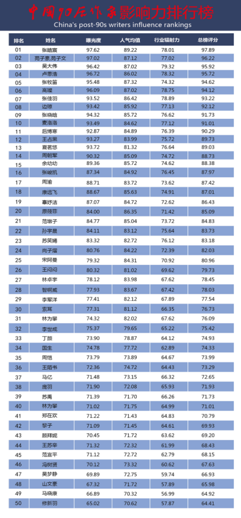 2018中國(guó)90后作家影響力排行榜上榜的50位作家: