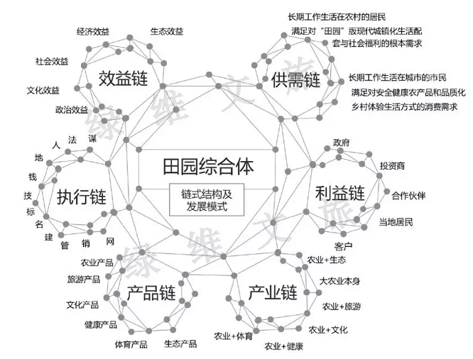 田園綜合體的“鏈”不是單一的一條鏈,而是一個以結(jié)構(gòu)搭建為核心的多鏈條、圈層化的復(fù)合結(jié)構(gòu),包括供需鏈、利益鏈、產(chǎn)業(yè)鏈、產(chǎn)品鏈、執(zhí)行鏈和效益鏈。