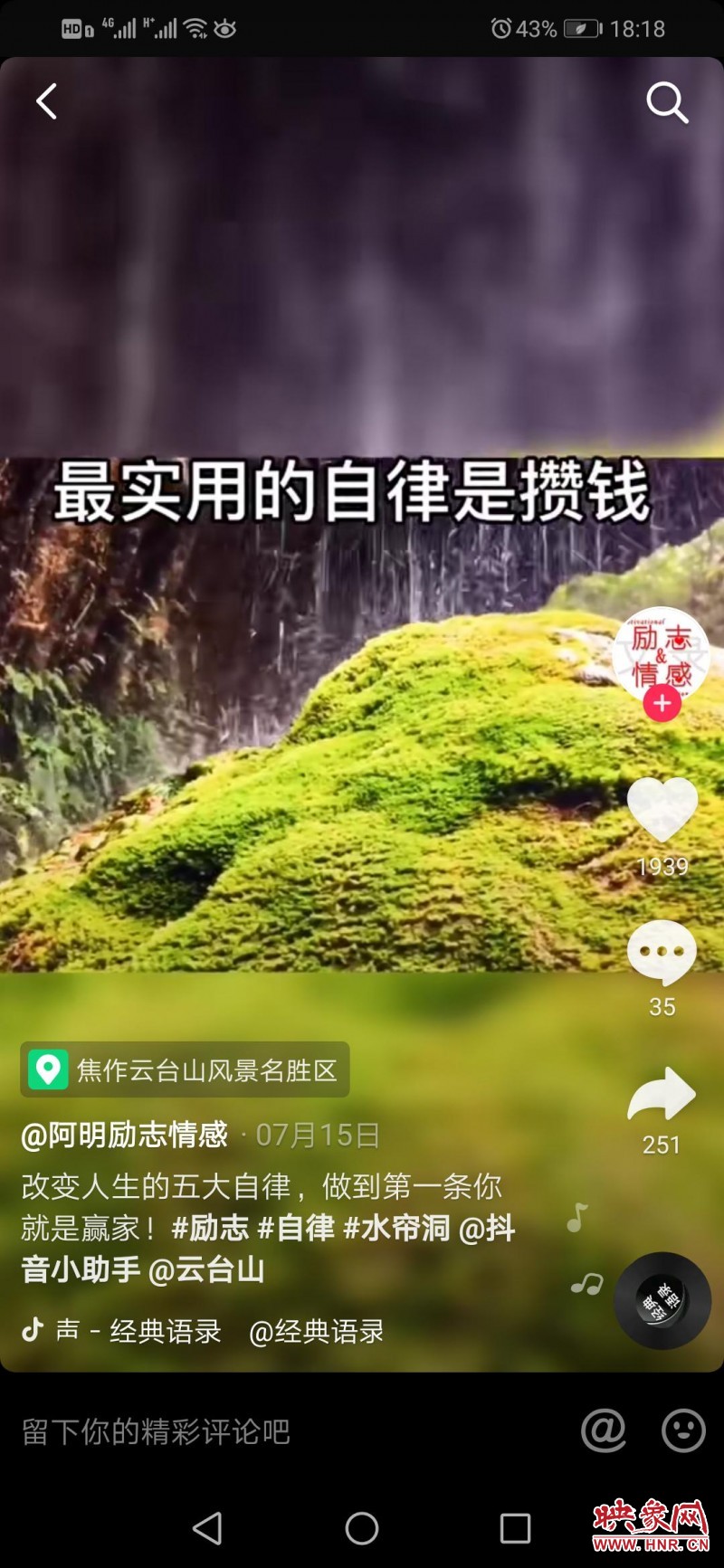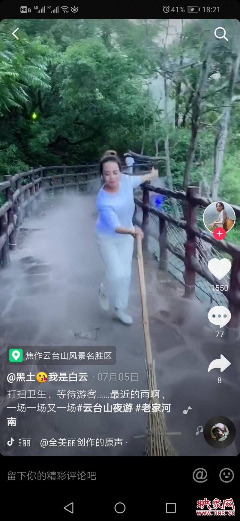 “有一次刷抖音,看到一個小姐姐在大山里配合音樂唱歌,感覺到是那么美,我就模仿這個視頻拍了一個抖音,當時的燈光、天氣特別美,發(fā)出來以后一下就火了。”郭白云說,“我工作的云臺山特別美,我就開始把歌曲和美景結(jié)合起來,推出一系列短視頻。”
