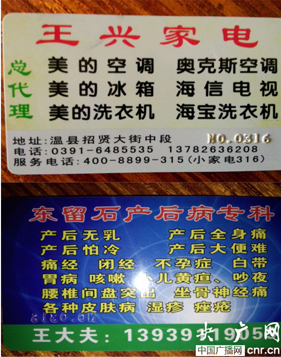在招賢鄉(xiāng)大街,有一家“美的電器”超市,專營(yíng)各式家電,店老板還廣發(fā)名片,招攬顧客。記者看到此廣告名片正面印有王興家電總代理,銷(xiāo)售各類(lèi)家電等字樣。讓人吃驚的是,名片背面卻是“東留石產(chǎn)后病?啤,超市老板“王大夫”主治“產(chǎn)后無(wú)乳”、“產(chǎn)后全身痛”、“產(chǎn)后怕冷”、“不孕癥”等婦科疾病,還能治“胃病”、“腰椎間盤(pán)突出”以及“各種皮膚病”。