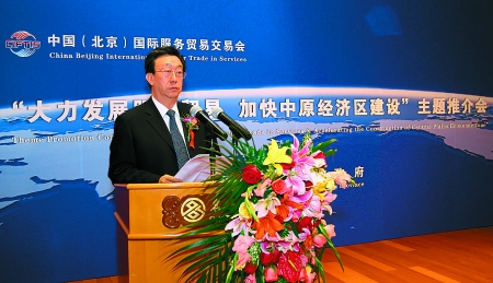 5月28日,“大力發(fā)展服務貿(mào)易 加快中原經(jīng)濟區(qū)建設”主題推介會在北京隆重舉行。省長郭庚茂發(fā)表主題演講。記者 董亮 攝