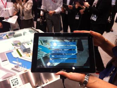 富士通東京國(guó)際論壇的展覽現(xiàn)場(chǎng)分為三大區(qū)域,近百個(gè)展位,展示包括產(chǎn)品、應(yīng)用、解決方案在內(nèi)的全方位ICT技術(shù)及應(yīng)用。展館入口的主題舞臺(tái)(圖1)處,屏幕上的山本正巳社長(zhǎng)為參觀者講述富士通堅(jiān)持以人為本的創(chuàng)新理念。主題舞臺(tái)后方,首先是 “社會(huì)創(chuàng)新”展示區(qū),該區(qū)域展示了富士通在交通、醫(yī)療、農(nóng)業(yè)、教育、能源等社會(huì)基礎(chǔ)設(shè)施領(lǐng)域的最新技術(shù)成果和應(yīng)用案例。通過詳細(xì)豐富的事例,參觀者可以直觀感受到未來可持續(xù)發(fā)展的社會(huì)形態(tài),親身體驗(yàn)ICT技術(shù)力量在商業(yè)和社會(huì)變革中的推動(dòng)作用。 隨后是 “業(yè)務(wù)創(chuàng)新”展示區(qū),這里展示的是ICT技術(shù)活用所帶來的商業(yè)業(yè)務(wù)模式變革,比如人們關(guān)心的大數(shù)據(jù)運(yùn)用、制造業(yè)革新、營(yíng)銷模式改變、、工作模式變革等。展覽的最后一個(gè)區(qū)域名為“支持創(chuàng)新的ICT技術(shù)”,這一區(qū)域展示了富士通最引以為傲的尖端技術(shù)、包括云服務(wù)、安全與業(yè)務(wù)連續(xù)性解決方案、高可靠高性能的基礎(chǔ)架構(gòu)平臺(tái)等產(chǎn)品和服務(wù)。