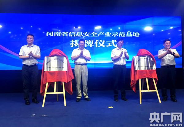 河南省工業(yè)和信息化委員會副主任朱鳴、鄭州市副市長史占勇、鄭州市工業(yè)和信息化委員會主任范建勛、金水區(qū)區(qū)長魏東為河南省信息安全產(chǎn)業(yè)示范基地、鄭州市信息安全產(chǎn)業(yè)示范基地揭牌。