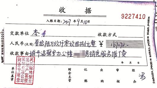 收據顯示,李女士所交的“推廣費”是武漢錦繡楚天房地產營銷策劃有限公司所收。記者聯系到該公司“陳總”,詢問這筆錢該不該收!澳阏f呢?”對方反問記者,并說,“我很忙,不想多談,要想退錢,可以去打官司。”