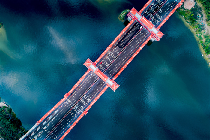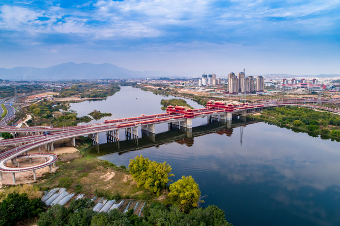 凌空俯瞰金峰大橋,紅色的廊亭、樓閣十分醒目的橫跨在九龍江西溪上。金峰大橋設計為景觀性大橋,主橋橋型采用“廊橋薌韻”方案,橋梁兩側(cè)人行道設置有長廊和古亭,橫向設置兩座人行天橋,紅磚瓦、燕尾屋融入了閩南特色建筑元素。金峰大橋是漳州九龍江上第一座具有“閩南薌韻”廊橋和古亭標志性的大橋,成為漳州一張最靚麗的名片。
