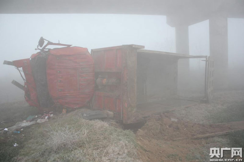 7時46分,消防官兵到達救援現(xiàn)場后發(fā)現(xiàn),一輛貨車側(cè)翻在高架橋路下的深溝里,駕駛室被橋底的石柱穿過,被困司機生死未卜。交警已將現(xiàn)場封鎖,120醫(yī)務(wù)人員也在現(xiàn)場待命。經(jīng)現(xiàn)場偵查,一名中年男子被卡在駕駛室,醫(yī)務(wù)人員已經(jīng)對其進行止血。根據(jù)現(xiàn)場情況,消防指揮員迅速確定救援方案,對嚴重變形的駕駛室進行破拆。消防官兵手持液壓擴張器變形的駕駛室進行擴張,擴大了救援空間。最終,在現(xiàn)場救援人員的共同努力下,被困人員于7時57分成功獲救,被送上救護車前往醫(yī)院救治。由于清晨正值大霧、霜降,地面濕滑前方能見度不足50米,此時貨車車速較快,在看見橋面時已經(jīng)來不及剎車,導(dǎo)致貨車沖出橋面,釀成本次事故的發(fā)生。