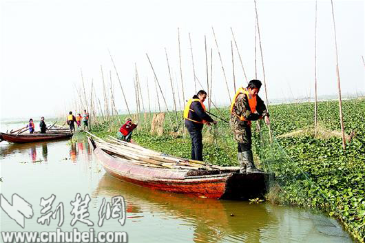 圖為昨日沙洋縣后港鎮(zhèn)港口村漁民開始拆除長湖圍欄圍網(wǎng)。(記者 楊富春 視界網(wǎng) 何長青 攝)