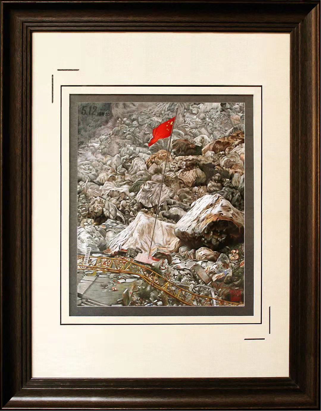 圖為:黃春萍為紀(jì)念汶川地震創(chuàng)作的《屹立的國旗》