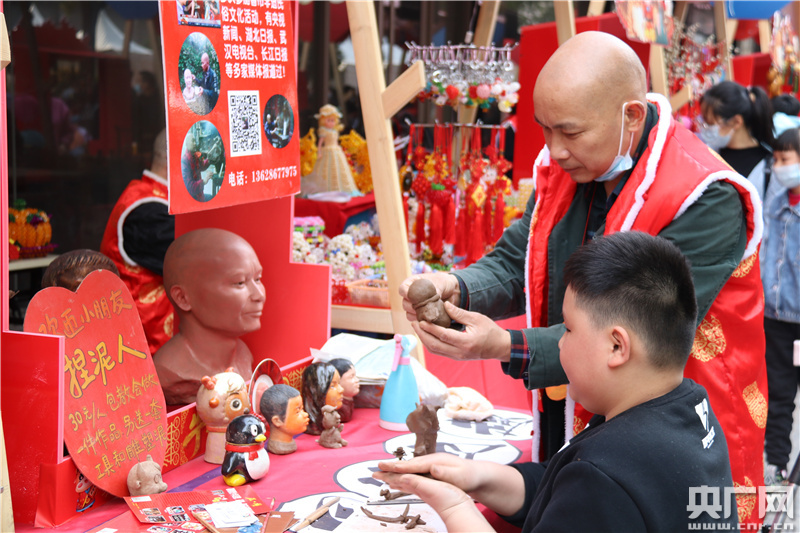 非遺市集添濃年味。主舞臺(tái)對(duì)面是由30余組花車組成的非遺市集。非遺市集格外紅火喜慶,精美的剪紙作品,憨態(tài)可掬的泥塑,漢繡、漢派石雕、魯班鎖、布藝堆繡、燈籠等工藝作品應(yīng)有盡有,還有小朋友最愛的糖畫。