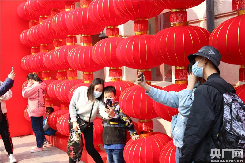 圖為:游客紛紛在火紅的背景墻前拍照“打卡” 央廣網(wǎng)發(fā) 李磊攝