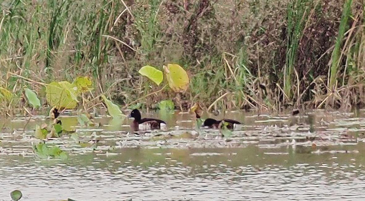 ▲藏身荷塘中的兩只青頭潛鴨 武漢市觀鳥協(xié)會供圖