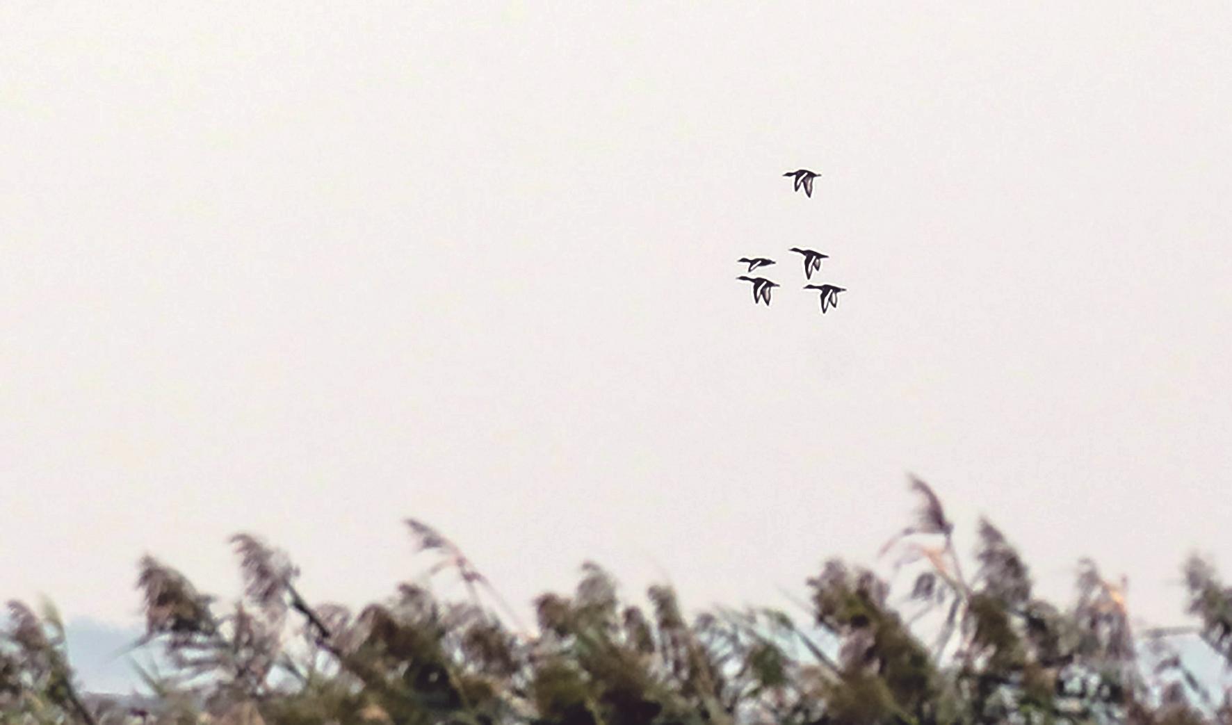 17日上午9時許,武漢市觀鳥協(xié)會副會長姚波帶領(lǐng)11名調(diào)查人員對蔡甸沉湖國際重要濕地進行生物多樣性調(diào)查。當(dāng)時一片幾個足球場大的水塘上,100多只綠頭鴨和1000多只羅紋鴨已如期遷徙至此,唯有兩只青頭潛鴨在一旁單獨活動;另外,距此水塘2公里左右的荷塘里,又發(fā)現(xiàn)兩只青頭潛鴨,大家精神振奮。之后,姚波從一張抓拍的鳥兒空中飛行照片中驚喜地發(fā)現(xiàn),自由飛翔的5只鴨,原來也是青頭潛鴨。