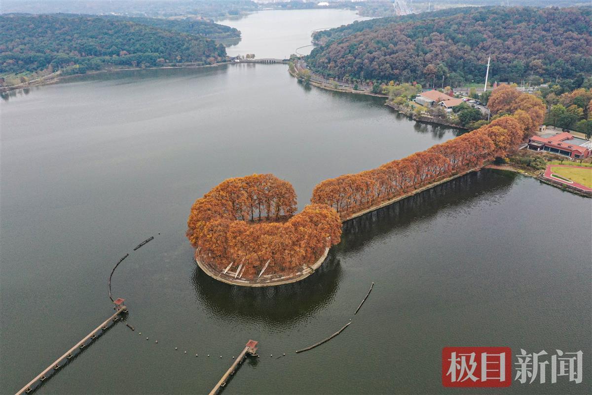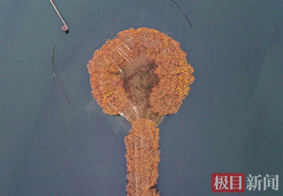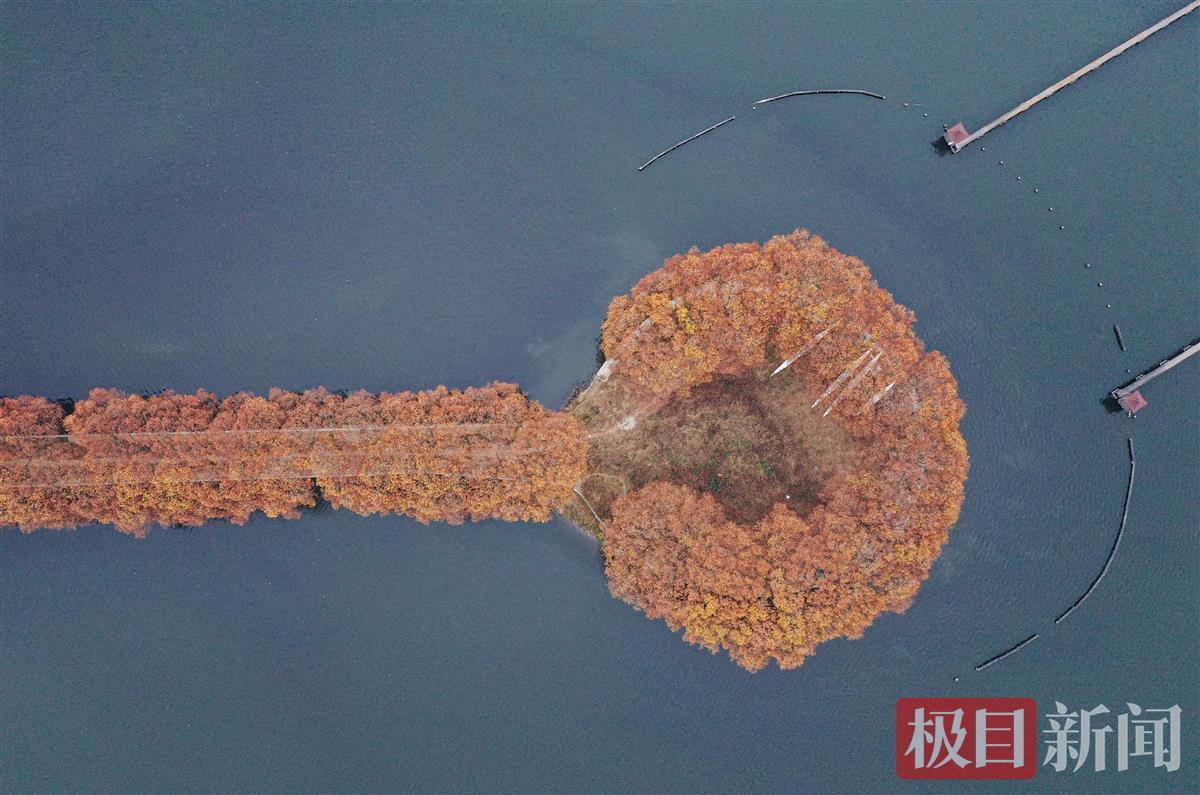 11月20日,極目新聞?dòng)浾咴谖錆h市東湖南山驛站附近看到,一條橙黃色的法國(guó)梧桐,仿佛一個(gè)驚嘆號(hào)伸入湖中,美不勝收!(極目新聞?dòng)浾?王永勝 攝)