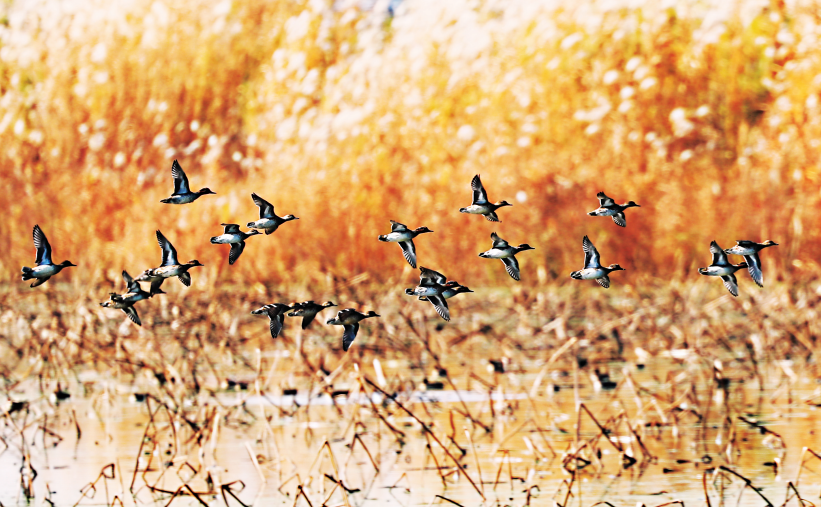 上涉湖省級(jí)濕地自然保護(hù)區(qū)內(nèi),綠翅鴨在蘆葦蕩上飛翔。長(zhǎng)江日?qǐng)?bào)記者何曉剛 攝
