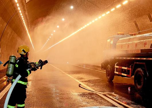 11月16日,省交通運輸廳在鄂西高速“荊楚第一隧”——金龍隧道舉行反恐綜合應(yīng)急演練。上午9時,1名“恐怖分子”駕車至金龍隧道入口處縱火,鄂西管理處、路政、高警、公安、消防、長陽縣政府安全應(yīng)急辦等多部門聯(lián)勤聯(lián)動,成功處置了應(yīng)急“險情”。圖為隧道內(nèi),消防員對事故車輛進行滅火作業(yè)。(視界網(wǎng) 何祝青 攝)