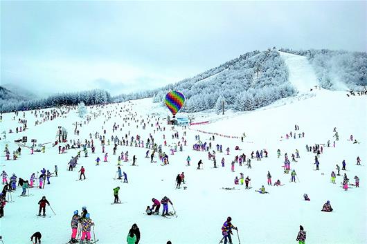 12月11日,游客在海拔2230米的神農(nóng)架國(guó)際滑雪場(chǎng)體驗(yàn)高山滑雪的樂(lè)趣。據(jù)介紹,神農(nóng)架滑雪節(jié)開(kāi)幕4天以來(lái),滑雪游客突破萬(wàn)人。目前,神農(nóng)架已建成4座滑雪場(chǎng),單日總接待量可達(dá)2萬(wàn)人,成為中國(guó)南方規(guī)模最大、功能最全的滑雪勝地。林區(qū)各大景區(qū)還推出堆雪人、打雪仗、賞霧凇等旅游產(chǎn)品,令來(lái)自全國(guó)各地的游客流連忘返。