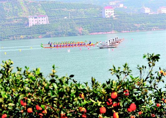 12月12日,在秭歸縣水田壩鄉(xiāng)吒溪河,參賽龍舟隊(duì)伍奮力爭(zhēng)先。當(dāng)日,第十屆湖北省龍舟大賽吒溪河舉行,來(lái)自全省的12支龍舟隊(duì)伍展現(xiàn)龍舟激情,喜慶臍橙豐收。