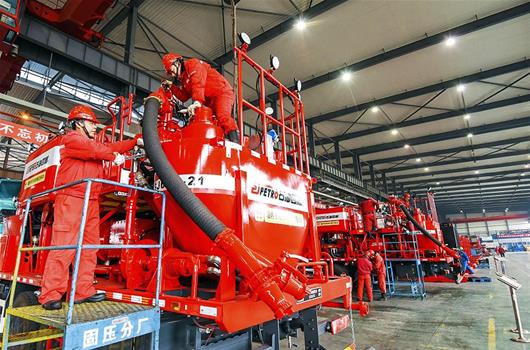 2月11日,位于荊州市的中國石化機械四機公司裝配集成廠,工人正在加緊生產(chǎn)第一季度出口訂單產(chǎn)品。春節(jié)期間,該公司科學調配產(chǎn)能、周密安排生產(chǎn)計劃,實現(xiàn)了出口安曼、印度等國的修井機、1300泵撬等油氣開采設備的順利總裝,部分設備已出口發(fā)運,實現(xiàn)了新春出口訂單“開門紅”。(視界網(wǎng) 黃志剛 攝)