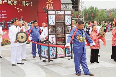 11月2日至3日,襄陽(yáng)市非物質(zhì)文化遺產(chǎn)展演(展示)活動(dòng),在該市唐城景區(qū)舉行,老河口木版年畫(huà)、棗陽(yáng)粗布、襄河道墜子等70多個(gè)“非遺”項(xiàng)目集體亮相,吸引觀眾駐足。圖為現(xiàn)場(chǎng)表演國(guó)家級(jí)非遺項(xiàng)目老河口鑼鼓架子。(視界網(wǎng) 曹鏑 攝)