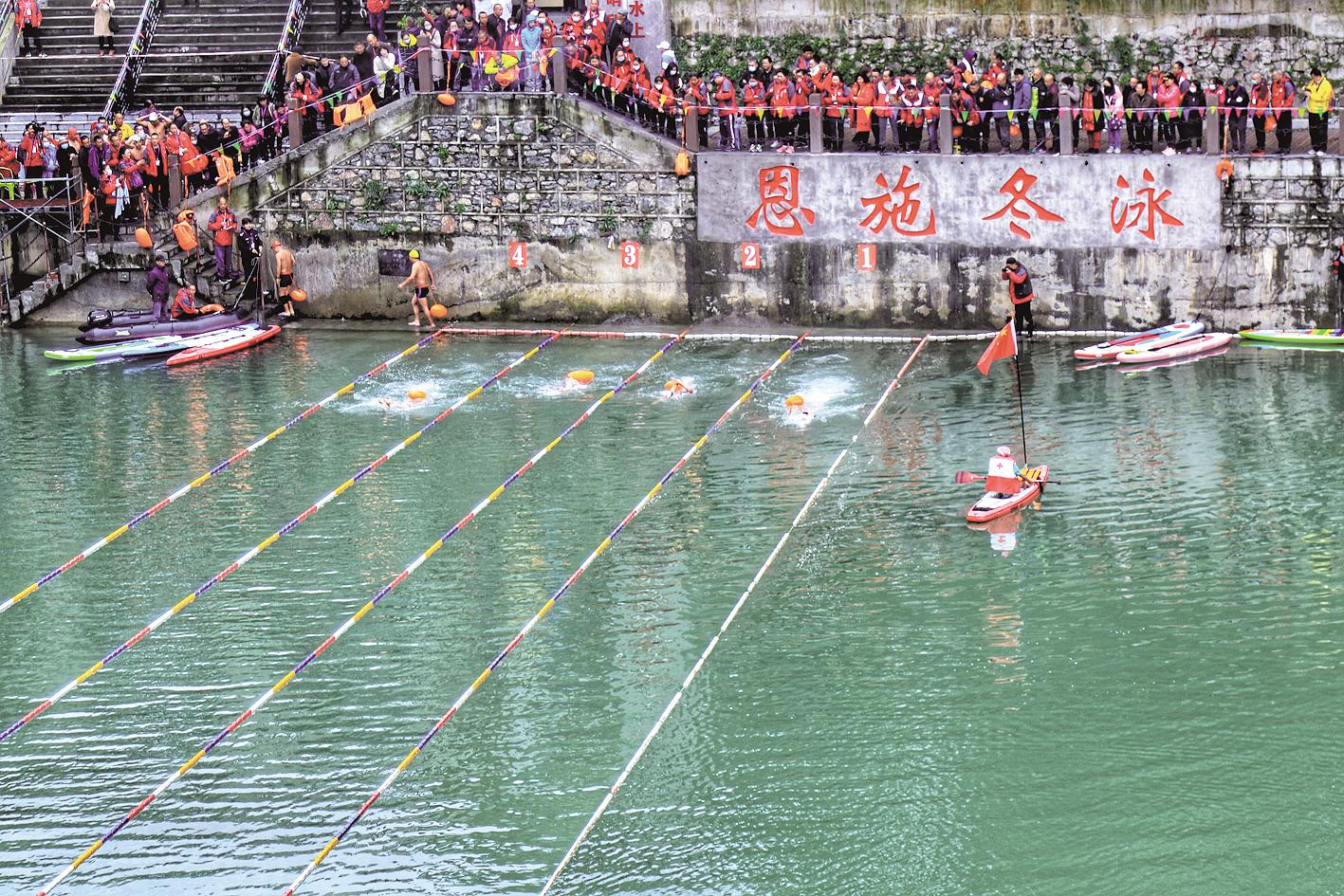 11月22日,游泳愛好者在恩施市城區(qū)清江河冬泳基地參加冬泳比賽。當(dāng)天,恩施州“百千萬”全民健身賽事活動(dòng)——2020年冬泳邀請(qǐng)賽暨水上救援演練如期舉行,來自湖北、浙江、重慶、河南等全國各地的300余名游泳愛好者,迎著小雪節(jié)氣,搏擊清江,挑戰(zhàn)嚴(yán)寒,上演一場“速度與激情”大戲。