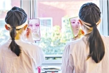參與漢劇名家名段演唱會的演員演出前化妝。