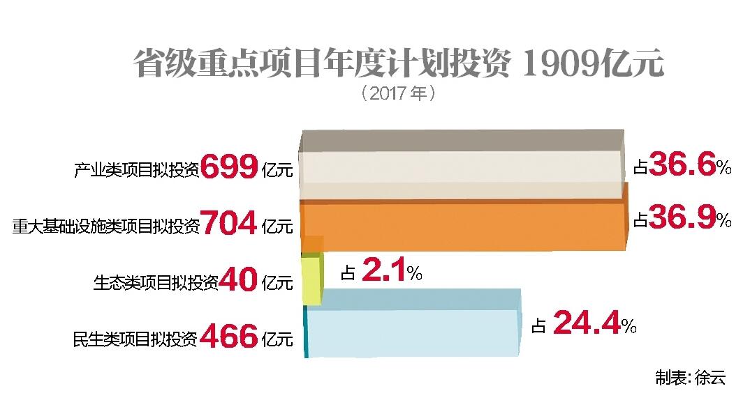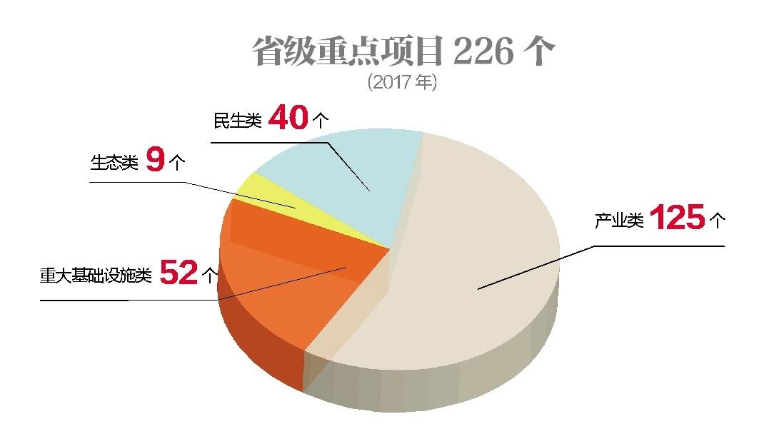 為發(fā)揮省重點建設(shè)項目對投資增長的示范帶動作用,今年,我省安排重點建設(shè)項目226個,總投資11123億元,年度計劃投資1909億元。其中,產(chǎn)業(yè)類項目125個,年度計劃投資699億元;重大基礎(chǔ)設(shè)施類項目52個,年度計劃投資704億元;生態(tài)類項目9個,年度計劃投資40億元;民生類項目40個,年度計劃投資466億元。
