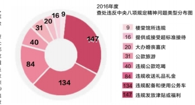 據(jù)介紹,2016年,違規(guī)發(fā)放津補貼或福利、違規(guī)配備和使用公務用車、違規(guī)收送禮品禮金等3類問題查處數(shù)量占查處問題總數(shù)的71.51%。同年,查處的隱形變異“四風”問題占全年查處問題總數(shù)的11%,較2015年增長1.5個百分點,主要表現(xiàn)為變相公款旅游、私車公養(yǎng)、擴大范圍“搭車”發(fā)放津補貼等。
