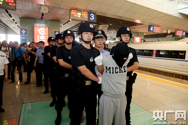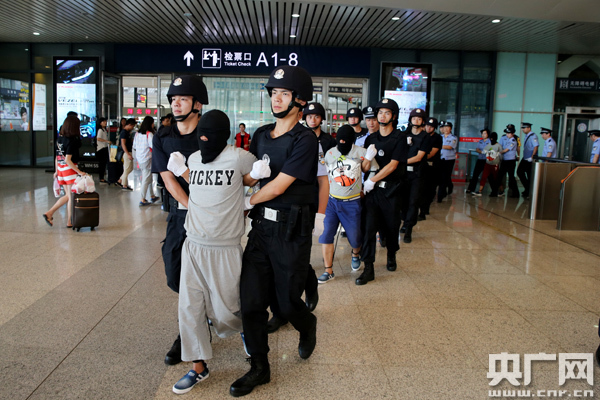 圖為:5月27日下午,從云南押解回漢的6名嫌疑人抵達武漢火車站(應(yīng)后威攝)