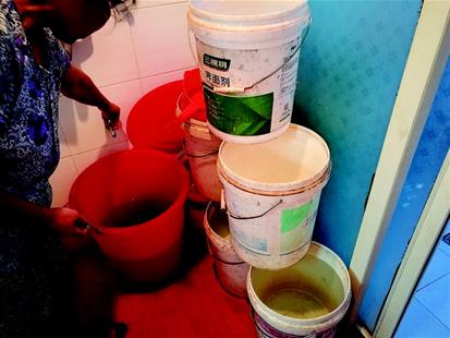 記者采訪發(fā)現(xiàn)多位居民家中都是備著十來個水桶和熱水瓶(如右圖)。