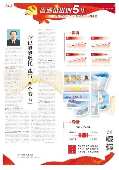 湖北日報訊(記者江卉)《人民日報》昨日推出“砥礪奮進的5年·迎接黨的十九大特別報道·湖北篇”,用8個彩色整版的篇幅,全方位、立體化地報道了湖北深入貫徹落實習近平總書記系列重要講話特別是視察湖北時的重要講話精神,全面深入總結(jié)了黨的十八大以來湖北經(jīng)濟社會發(fā)展和黨的建設(shè)取得的豐碩成果以及巨大變化。“湖北篇”同時刊發(fā)了省委書記蔣超良的署名文章《牢記殷殷囑托 踐行“四個著力”》,以及人民日報記者對省委副書記、省長王曉東的專訪《改革“釘釘子”敢為天下先》。
