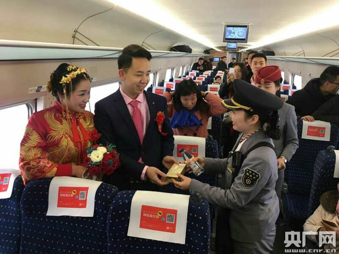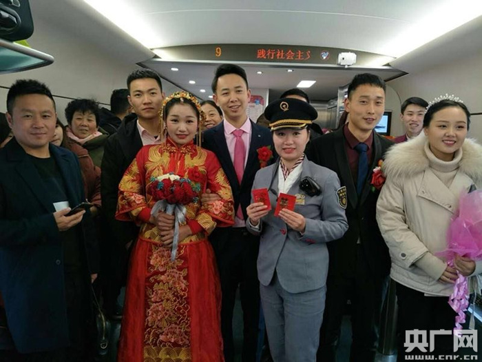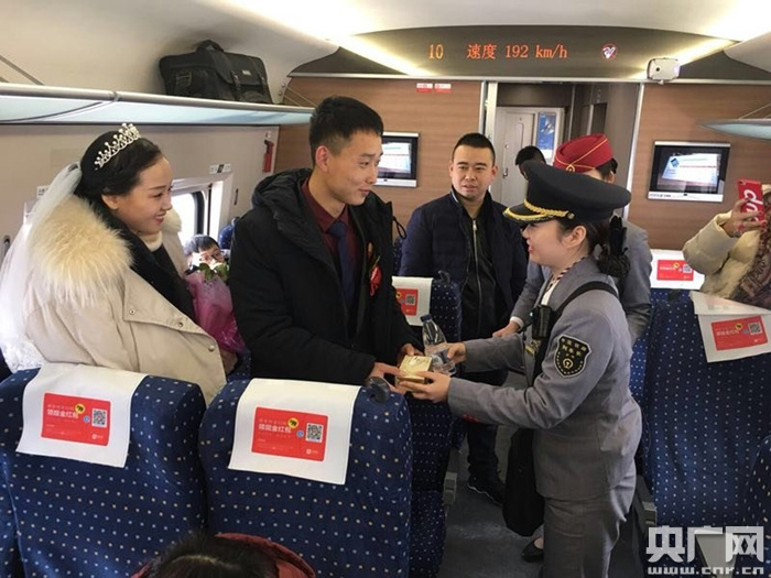 1月5日上午,李先生成功接到了新娘,坐上了G510次列車返回明港,沒想到在車上碰上了另一對同樣坐高鐵接親的夫妻。列車長許青見到幾人穿著結(jié)婚禮服,便上前進行詢問。