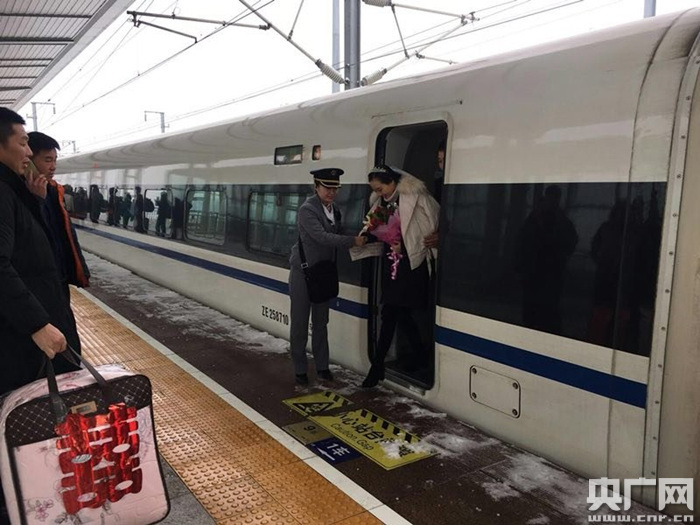 “你們幾個一定要好好在一起,這段感情今天可是成功經(jīng)歷了老天的考驗啊!”“坐高鐵接親,我還是第一次見到!”周圍的旅客紛紛說到。