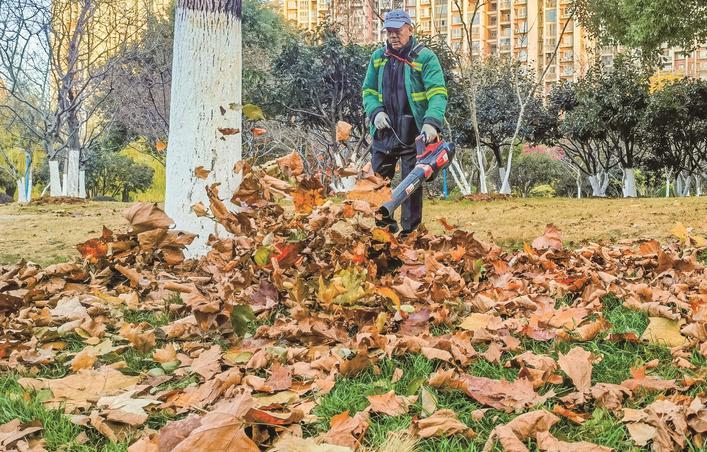 12月14日上午,武漢市關(guān)山公園內(nèi),園林工人忙著清理地面落葉,“落葉不掃”觀(guān)賞期接近尾聲。