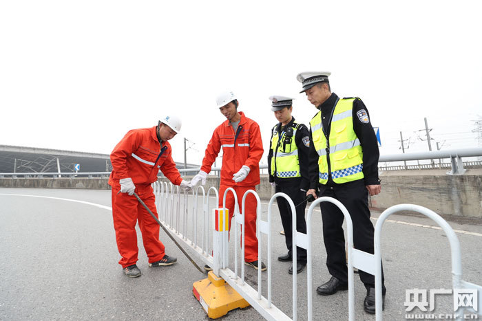 11月16日,武漢火車(chē)站車(chē)行平臺(tái)匝道,武漢市交通管理局鐵路大隊(duì)民警督導(dǎo)加裝隔離護(hù)欄。