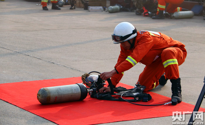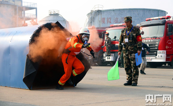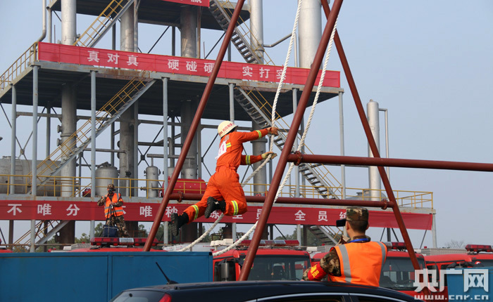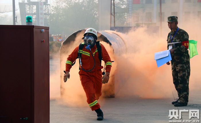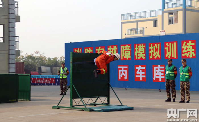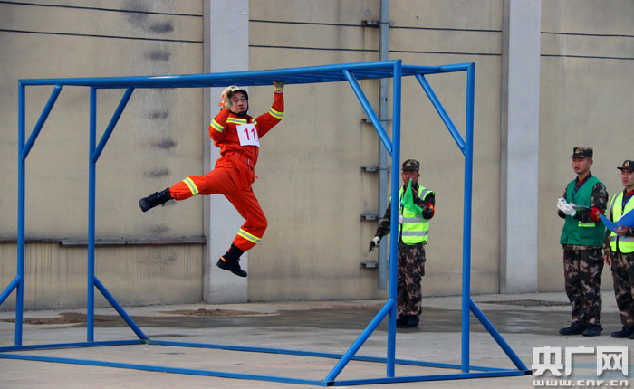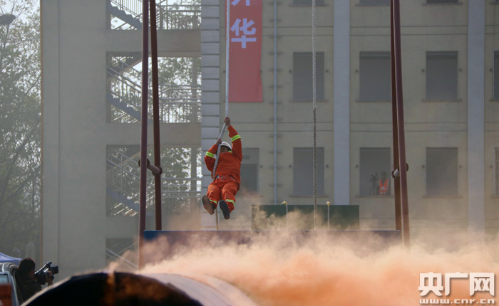 圖為:湖北消防實戰(zhàn)化練兵比武現(xiàn)場,一名參賽的消防戰(zhàn)士正在挑戰(zhàn)單兵攻堅項目
