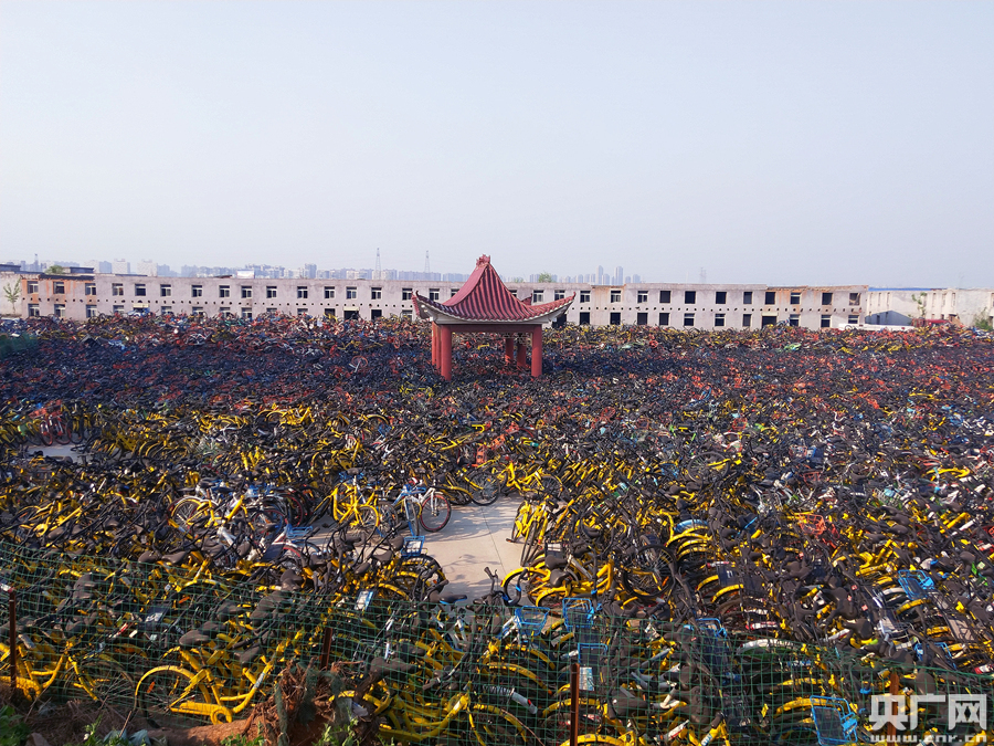 近日,湖北省武漢市洪山區(qū)世茂林嶼岸小區(qū)附近的一塊空地上堆滿了共享單車,空地中的涼亭變“孤島”。