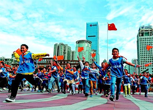圖為:10月1日上午9時,武漢市洪山廣場,中小學(xué)生與各界群眾代表,一起參加升國旗儀式,共慶新中國成立 69周年。(湖北日報全媒記者 倪娜 通訊員彭雪琴 謝助全 攝)