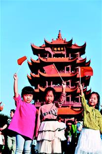 圖為:10月4日,武漢黃鶴樓景區(qū),3名外地小游客揮舞著手中的國旗。(湖北日報全媒記者 魏錸 攝)