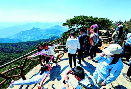 圖為:10月3日,在羅田縣薄刀峰山頂,游客觀賞美麗的大別山景色。(湖北日報全媒記者 張朋 通訊員 劉世民 攝)